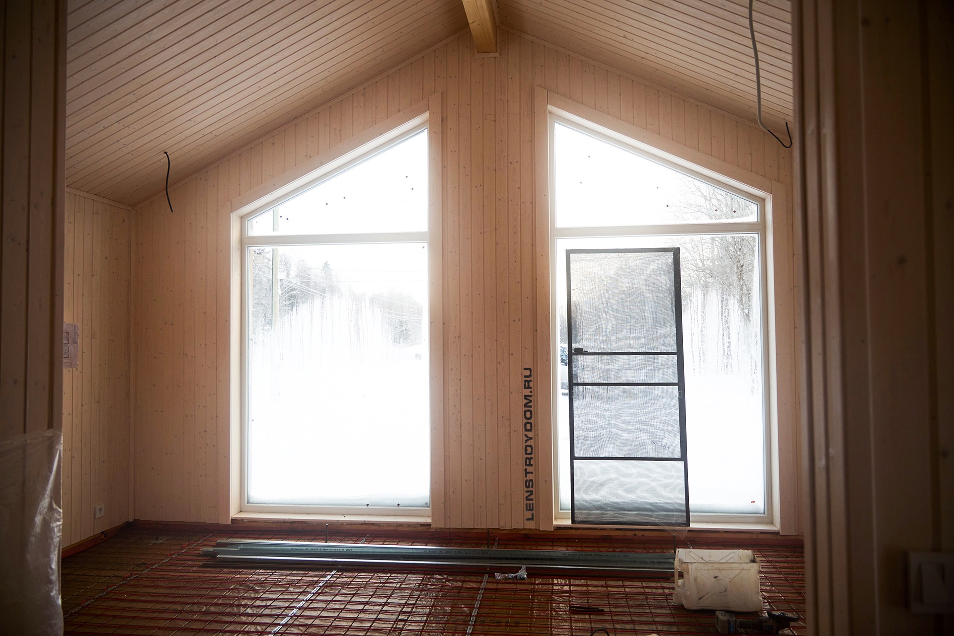 Для внешней отделки применялась скандинавская доска 23х150 мм с гладкой поверхностью, смонтированная вертикально с покраской на производстве в лессирующий цвет. Внутри дома в качестве отделочного материала на стенах и потолке использовалась евровагонка,