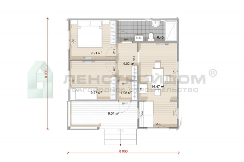 Проект каркасного дома «Таменгонт» (Назия) 8х8 м Размер: 8х8м Площадь застройки: 64 м2 Общая площадь: 64 м2 Жилая площадь: 55 м2 Площадь террасы: 9 м2 Цена: 1 380 000 Р Планировки Фасады Планировки Фасады Рассчитайте цену вашего дома Узнать цену дома