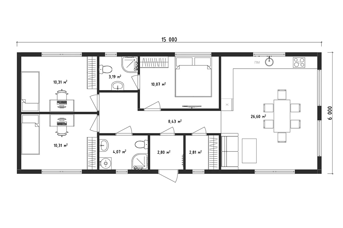 Отличительной чертой, объединяющей все серии, является общее объемно-планировочное решение: ширина дома и разрез по фронтонной стороне является абсолютно одинаковым для всех домов, а отличие – только в длине дома.