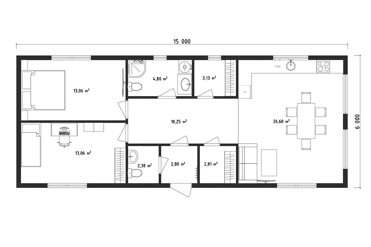 • дом разделен на два изолированных крыла буферной зоной из кладовок и С/У